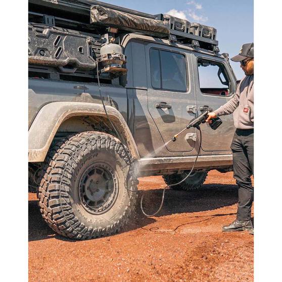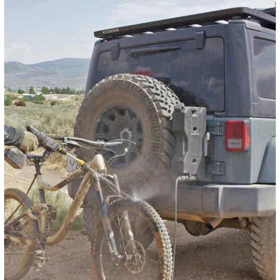 Most other overland water tanks on the market run by using an external source to pressurize the air inside the tank. One of the main downfalls of this concept is as you start to spray water out of your tank, you are also spraying out your air pressure supply. Your tank may start out spraying at 45 PSI, but once you have sprayed out half your water supply, you will also have about half the pressure. You then will have a useless pressure supply of only about 20 PSI and will have to manually re-pressurize your tank. Using an external pump in the sprayer, we avoid this pressure loss flaw. Instead, the Rain Flare supplies a consistent pressurised stream with a portable battery that will run for 30 minutes total spray time -enough time to empty your tank multiple times without recharging.