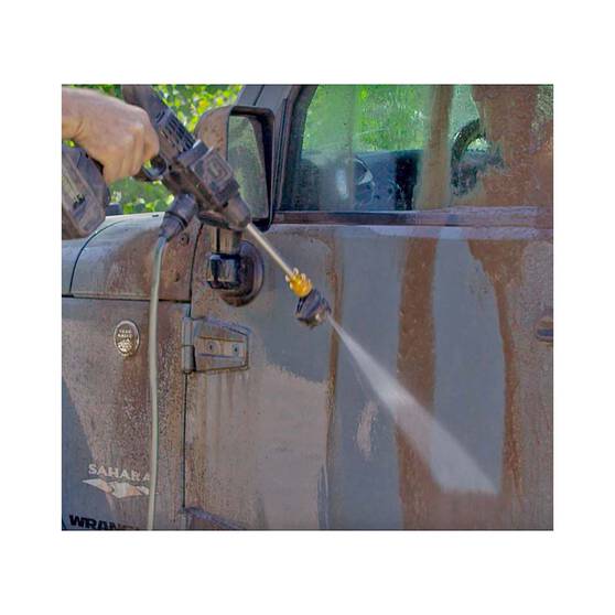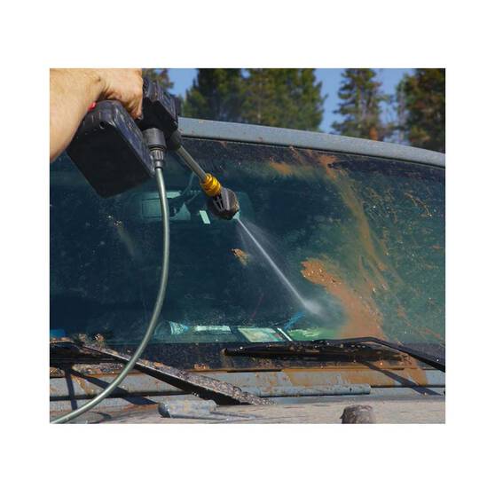 - Battery powered portable pressure washer that sprays up to 400 PSI